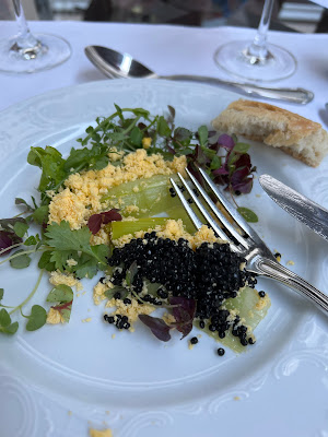 The food at our Hotel was probably the best yet, but all the food in France was wonderful....Check out the two salads below... Yes, that's caviar... and our server wasn't bad looking either, some say (Cheryl) a George Clooney look alike....